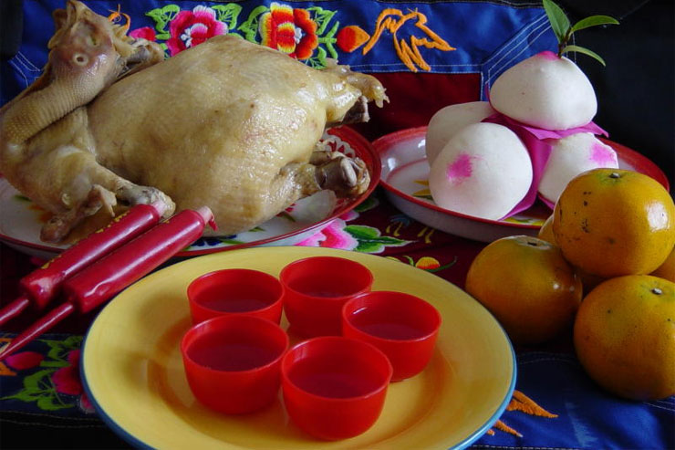 มาถึงเรื่องอาหารการกินครับ เมื่อก่อนของเซ่นไหว้ที่จะให้ครบ ต้องมีไก่ต้ม เป็ดต้ม ปลานึ่ง หมูสามชั้นต้ม หมี่ผัด หน่อไม้จีนต้มกับไก่ ผลไม้ก็มี ส้ม แอปเปิ้ล สาลี่ กล้วยหอม เมื่อไหว้เจ้าเสร็จ