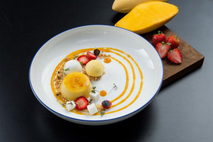 จานนี้คงทำให้คนชอบผลไม้ 2 ชนิดนี้ถึงแก่คลั่งไคล้ในรสชาติกลมกล่อมเข้ากัน รับประทานแล้วสดชื่นตื่นตัวด้วยรสเปรี้ยว ทั้งยังได้กลิ่นหอมและหวานละมุนจากพานาคอตต้ามะพร้าวเข้ามาเสริม จานนี้ตกแต่งหน้าตาด้วยผลไม้รวมทั้งใบไม้เล็กๆ และซอสผลไม้ ในแต่ละคำให้ตักครบทุกองค์ประกอบของจาน แล้วรับประทานไปพร้อมๆ กันจะทำให้ได้รสชาติครบครัน