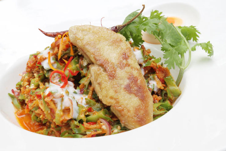 เริ่มกันที่เมนูกินเล่นอย่าง ข้าวเกรียบกุ้ง-น้ำพริกเผา ที่เสิร์ฟเป็นอมูส-บุชแบบฝรั่ง น้ำพริกเผารสเด็ดมากขนาดที่ลูกค้าชาวมาเลเซียมักมาสั่งกลับไปกินเป็นกิโลๆ รสชาติกลมกล่อม ไม่หวาน ไม่มันเยิ้มแบบเจ้าอื่นๆ