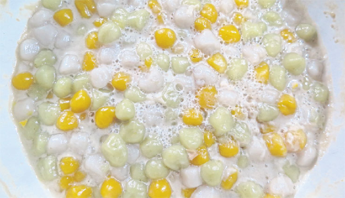 สำหรับขั้นตอนการทำ ใหม่บอกว่า เริ่มจากการหั่นเผือก ฟักทองดิบๆ เป็นชิ้นบางๆ แล้วนำแต่ละอย่างไปนึ่ง เสร็จเอาไปบดผสมกับแป้ง ซึ่งใช้แป้งข้าวเหนียว นวดให้เข้ากันแล้วปั้นเป็นเม็ดบัวลอย ส่วนที่เป็นเผือกจะออกสีม่วงจางๆ ฟักทองเป็นสีเหลือง ส่วนใบเตยล้างให้สะอาดแล้วนำไปปั่นเอาน้ำ จากนั้นเอาไปผสมนวดกับแป้งจนเข้ากันแล้วปั้นเป็นเม็ดเล็กๆ เช่นกันโดยเม็ดจะออกสีเขียวจากใบเตย