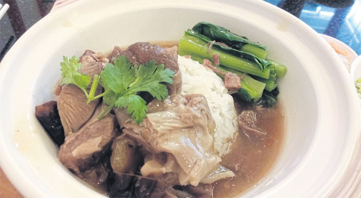 เมนูแนะนำสำหรับคนชอบรับประทานข้าวอย่างอิฉัน ข้าวหน้าหมูตุ๋น หรือเนื้อตุ๋น ซึ่งร้านจะใช้ข้าวหอมมะลิร้อนๆ ราดหน้าด้วยหมูตุ๋นเครื่องยาจีนร้อนๆ หอมเครื่องยาจีน รับประทานกับน้ำส้มพริกตำสีส้มสวยเสิร์ฟในหม้อดินและผักกวางตุ้งลวก เนื้อหมูนุ่มมากๆ มีเอ็นติดมาด้วยให้เคี้ยวเพลินๆ แป๊บเดียวหมดจาน