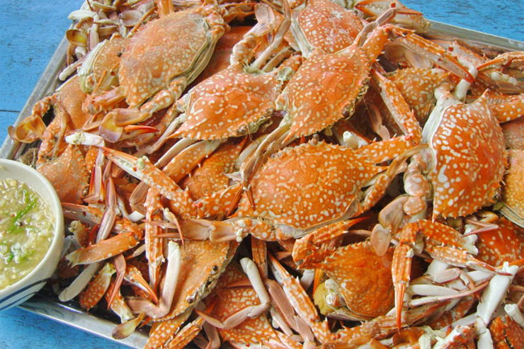 ปูม้านั้นรู้แล้วว่าต้องนึ่งอย่างเดียว ซื้อแล้วหาร้านอาหารตามสั่งง่ายๆ กินกับข้าวเขาสองอย่าง จ้างนึ่งปูม้าให้ด้วย จากที่มันถูกแกะจากอวนยังดิ้นกระแด่วๆ มานอนเรียงสีแดงเต็มชาม รับรองเพื่อนกิน แกะกินไม่พูดไม่จากัน ใครแกะได้เร็ว ได้มาก ก็กำไร ปกติทุกเรือปูจะมีปลาติดอวนมาด้วย ส่วนใหญ่เป็นปลาลิ้นหมาก็ทอด มีปลาทูก็ย่าง มีปลาทรายก็ทอด หรือต้มยำ หรือแกงป่า ส่วนน้ำจิ้มเป็นน้ำปลาพริก บีบมะนาว กระเทียมหั่นหน่อย เหลือเฟือแล้ว