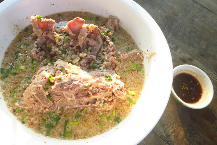 จานที่สองคือ ก๋วยเตี๋ยวต้มยำตำลึง ที่มีให้เลือกว่าจะสั่งเป็นหมูหรือปลาตามใจชอบ เพราะสั่งเล้งไปแล้วเราจึงสั่งลูกชิ้นปลามาลอง ซึ่งไม่ทำให้ผิดหวัง ชามต่อมาคือก๋วยเตี๋ยวเส้นเล็กแห้ง ที่ยำมาในชามใส่มาให้ทั้งถั่วลิสงคั่วทำเองจึงไม่หืน พริกป่น น้ำตาล และหอมกลิ่นมะนาวที่บีบสดๆ อีกเมนูเด็ดก็มีเกาเหลากระดูกอ่อนใบพาย เป็นหมูชิ้นที่ผ่านการเคี่ยว 2 ชั่วโมง สาวๆ และเด็กจะต้องชอบเมนูนี้เพราะกินง่าย หมูชิ้นขนาดเท่าลูกเต๋าพอดีคำ ส่วนเมนูอื่นๆ ที่หลายคนไปลองแล้วยกนิ้วให้ก็มี เครื่องในต้มแซบ เกาเหลาเลือดหมู ก๋วยเตี๋ยวต้มยำกระดูกเล้ง เล้งต้มแซบ ลวกจิ้ม และหมูสะเต๊ะ ที่อร่อยเพราะหมูนุ่มมากๆ ไม่แห้งและบางจนเกินไป
