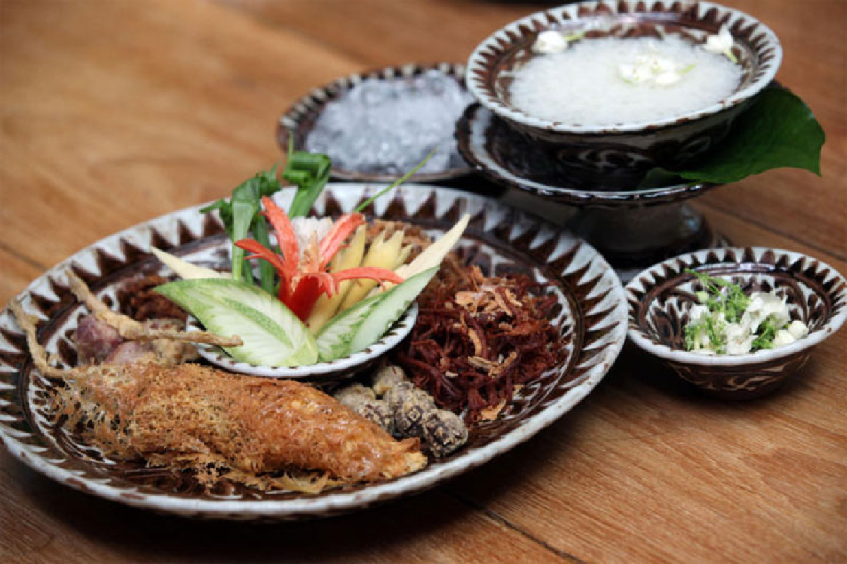 “จากนั้นก็มีอย่างอื่นเข้ามาอีก เช่น เนื้อเค็มฝอย ฉีกเป็นเส้นเล็กๆ ผัดกับน้ำตาลจนหวานกรอบ โรยด้วยหอมเจียว นอกจากนี้ยังมีหอมโทนมีหาง มาตัดจุก แล้วคว้านไส้ออก แล้วเอาเนื้อปลาผัดยัดเข้าไป แล้วชุบแป้งทอด ทุกอย่างเป็นคำๆ หมด เพราะสมัยก่อนใช้มือกินกับเข้าปาก ยกเว้นข้าวแช่ที่ต้องใช้ช้อนตัก”