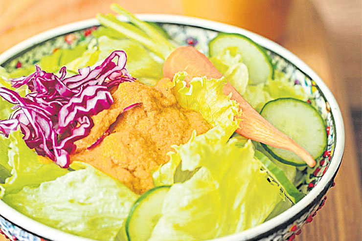 ไม่น่าเชื่อว่าสลัดในชามแก้วใบจ้อย ที่แช่เย็นเจี๊ยบจนไอน้ำเกาะ มีผักเพียงแค่ Iceberg Lettuce หรือผักกาดแก้ว กะหล่ำม่วงหั่นฝอยๆ และแครอตซอยเป็นเส้น รูปแบบง่ายๆ ราดน้ำสลัดแครอตและขิง แช่เย็นมาอย่างดี รับประทานแล้วต้องหยุดคิดถึงความสามารถของคนที่คิดค้นเมนูนี้ จนเกือบลุกขึ้นปรบมือให้