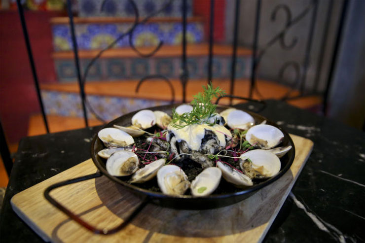 เมนูต่อมา Arroz Negro ข้าวผัดซีฟู้ดจานใหญ่ที่มาพร้อมกับปลาหมึก และหอยตลับจากฝั่งทะเลไทย ปรุงรสด้วยเกลือ ส่วนหอยตลับกับปลาหมึก นำไปอบกับซอส เสิร์ฟมาบนกระทะแบบสเปน รสชาติอร่อยกลมกล่อม