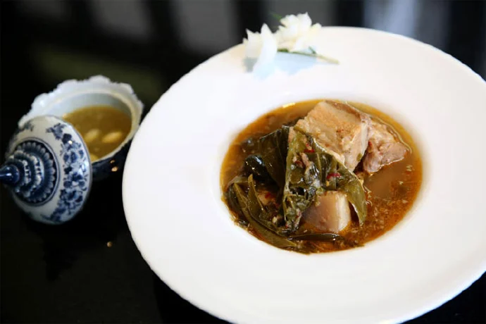 เมนูต่อมา แกงหมูใบชะมวง หากใครทราบดี จะรู้ว่าฤดูนี้ใบชะมวงอุดมสมบูรณ์มาก ซึ่งเมนูนี้เราใช้ยอดใบชะมวงอ่อน ส่วนแกงหมู เราใช้หมูสามชั้นมาทำเพื่อให้เกิดความอบอุ่น และมีความมันตัดกับความเปรี้ยวของใบชะมวง และมีส่วนผสมเป็นพริกไทยที่มีความเผ็ดร้อน ให้ความอบอุ่น อีกทั้งเป็นเมนูที่หารับประทานยากในเมืองกรุง (เป็นเมนูประจำของ จ.ระยอง และจันทบุรี) ต้องรับประทานในฤดูฝน สำหรับประโยชน์ของใบชะมวง ใบชะมวงมีวิตามินซีและแคลเซียมสูง ต้านทานโรคหวัดได้ดีอีกด้วย