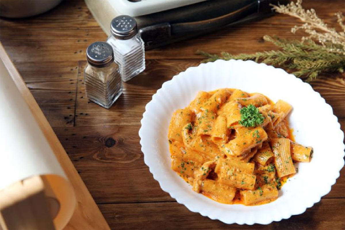 สำหรับอาหารของร้านเน้นเป็นอาหารที่รับประทานได้ทั้งวันตั้งแต่เช้ายันค่ำ เมนูส่วนใหญ่จึงไม่ซับซ้อนแต่เน้นวัตถุดิบที่มีคุณภาพ มีให้เลือกหลายสไตล์เพราะลูกค้ามีทั้งญี่ปุ่น เกาหลี และชาวตะวันตก เราจึงได้ลองชิมเมนูสำหรับสาวสายสุขภาพและไม่กินเนื้อสัตว์ชื่อ Garden Soba Salad เป็นเส้นโซบะนุ่มๆ มาในกระทะเหล็กเพิ่มสีสันและรสชาติด้วยมะเขือเทศ ข้าวโพดอ่อน เบบี้แครอต และเห็ดย่าง กลิ่นหอมจากงาที่โรยหน้ามาและรสชาติที่ไม่จัดเกินไปทำให้สาวๆ ที่ใส่ใจสุขภาพต้องชื่นชอบเมนูนี้ ถัดมาเป็น Chicken Alfredo Pasta ใช้ริกาโตนี่ผัดใส่ซอสครีมและเพิ่มสีสันด้วยผงปาปริก้า ได้สีสวยและรสชาติไม่หนักจนเกินไป