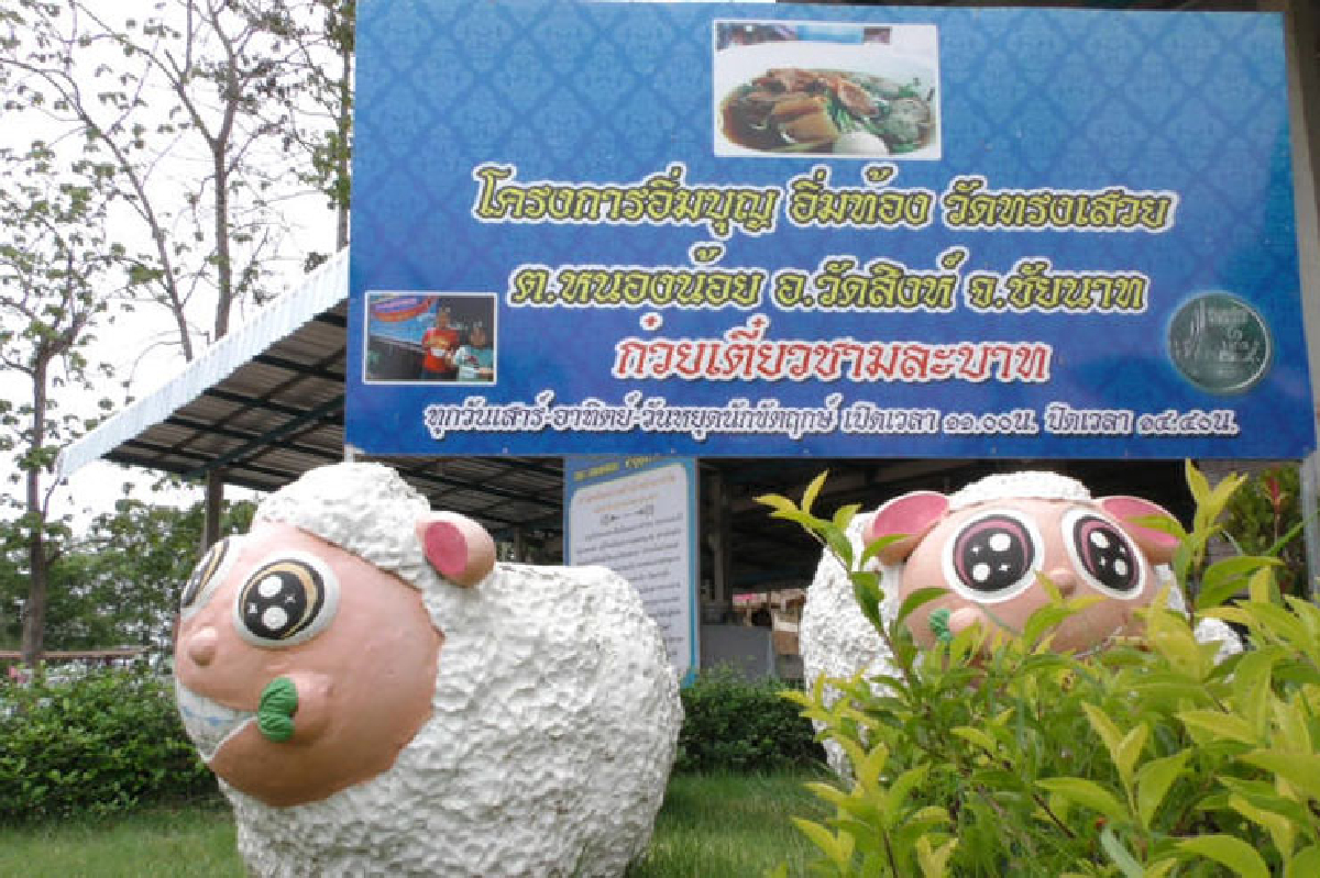 ณ วัดทรงเสวย ต.หนองน้อย อ.วัดสิงห์ จ.ชัยนาท ได้เปิดโรงทานจำหน่ายก๋วยเตี๋ยวให้กับญาติโยมที่มาทำบุญด้วย ราคาเพียงแค่ "ชามละ 1 บาท” ตามโครงการ "อิ่มท้อง อิ่มบุญ” โดยมีพุทธศาสนิกชนเดินทางมาใช้บริการของก๋วยเตี๋ยวบุญอย่างคึกคักต่อเนื่อง โดย ปราณี มหัคคะประทีป แม่ครัวก๋วยเตี๋ยวบุญ เปิดเผยกับทีมข่าวว่า ในช่วงแรกเมื่อ 1 ปีก่อน แม่ครัวจะเตรียมก๋วยเตี๋ยววันละประมาณ 300 ชาม แต่ปัจจุบันมีพุทธศาสนิกชนทราบข่าวโครงการก๋วยเตี๋ยวบุญมากขึ้น ทำให้ต้องเตรียมก๋วยเตี๋ยวเพิ่มเป็นวันละ 500 ชาม โดยยังคงแนวทางการเชิญชวนทำบุญด้วยการหย่อนปัจจัยลงตู้บริจาคชามละ 1 บาทเช่นเดิม