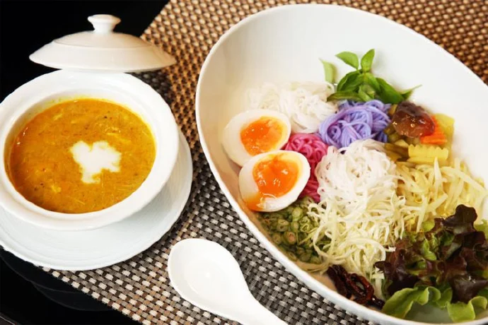 มาถึงเสน่ห์จันทน์ รับรองว่า จะต้องติดใจในรสมืออาหารไทยแบบดั้งเดิม ที่คัดสรรวัตถุดิบอย่างดีซิกเนเจอร์ที่แนะนำ คือ ขนมจีนน้ำยาปู เสิร์ฟมาพร้อมขนมจีน ไข่ต้ม และผักเคียง พระเอกของเมนู คือ แกงปูรสจัดจ้านกลมกล่อมเข้ากับปูก้อนโต กินคู่กับขนมจีนต้ม ที่เพิ่มกิมมิกด้วยการผสมสีธรรมชาติอย่างอัญชันและบีตรูต