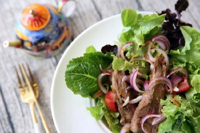 เริ่มด้วยเมนูซิกเนเจอร์ ยำซี่โครงหมูตุ๋น สูตรจากก้นครัวที่ใช้ซี่โครงอ่อนตุ๋นยาจีนจนเปื่อยนุ่ม ปรุงรสด้วยน้ำยำที่ใช้น้ำตุ๋นยำกับพริกสด เสิร์ฟคู่กับสลัดผักสดออร์แกนิก แค่หน้าตาก็ชนะเลิศแล้ว
