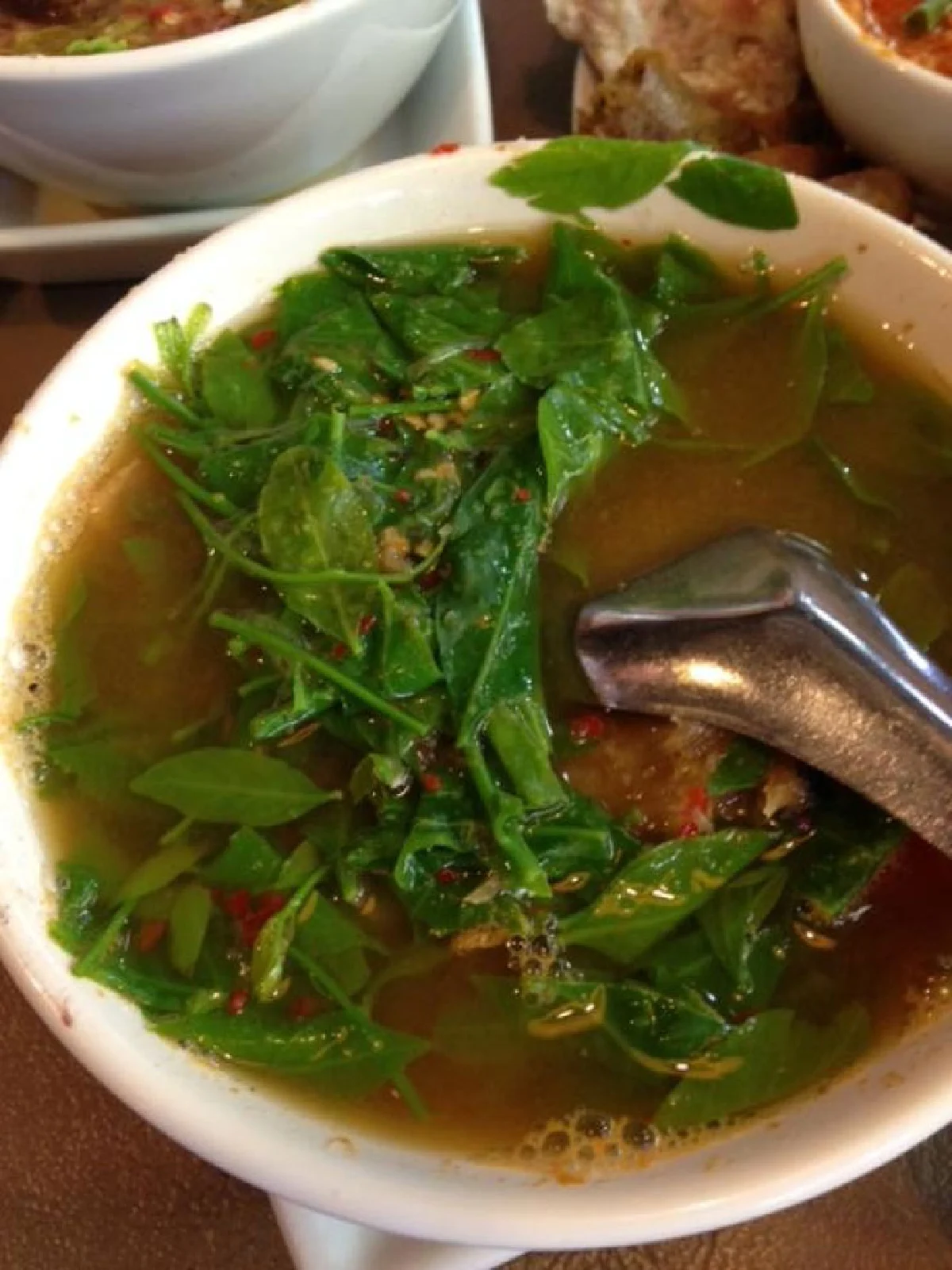 เมื่อเดินเข้าร้านผู้เขียนก็ไม่พลาดที่จะสั่งเมนูเห็ดถอบ ซึ่งโดยเมนูแรกที่เลือกคือเห็ดถอบแกงมะขาม ในความหมายคือแกงแบบใส่กะทิ เพราะเคยทานแกงเห็ดถอบใส่กะทิและกุ้งเยี่ยมมากๆ แต่ที่ร้าน แกงยอดมะขามเห็ดถอบจะเป็นแบบแกงต้ม ใส่น้ำปลาร้านิดหน่อย และใส่เห็ดกับยอดมะขาม เท่านั้น รสชาติถือว่าใช้ได้ เหมาะกับการเดินทาง ที่เหนื่อย ได้ซดน้ำแกงเห็ดมะขาม ชามนี้ทำให้รู้สึกโล่ง คล่องคอดี