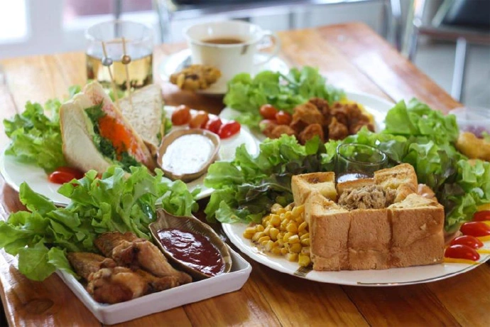 ณัฐวุฒิ กล่าวอีกว่า ขณะที่เมนูอาหารกินเล่น หรืออาจจะเป็นเมนูหลัก เริ่มจากสลัดทูน่า กับโทสต์ ราดด้วยน้ำสลัดญี่ปุ่น ต่อด้วยแซนด์วิชไส้ทะลักชิ้นละ 25 บาท ที่เรียกว่าไส้ทะลักจริงๆ ใน 3 ไส้หลัก คือ ไส้ทูน่า-ปูอัด พริกเผา-หมูหย็อง-ไข่ดาว และเบคอน-ไข่กุ้ง