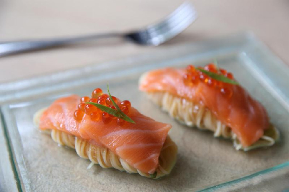 ต่อด้วย Chilled Salmon Angel Hair อีกหนึ่งเมนูที่ฟิวชั่นระหว่างอิตาเลียนและญี่ปุ่น ใช้พาสต้าเส้น Angel Hair นำไปคลุกเคล้ากับซอสสูตรเฉพาะของทางร้านและทรัฟเฟิลออยล์ พันวางเป็นชิ้นขนาดพอดีคำ ท็อปด้วยแซลมอนจากนอร์เวย์และไข่ปลาแซลมอน เรียกความสดชื่นได้อย่างเนียนๆ