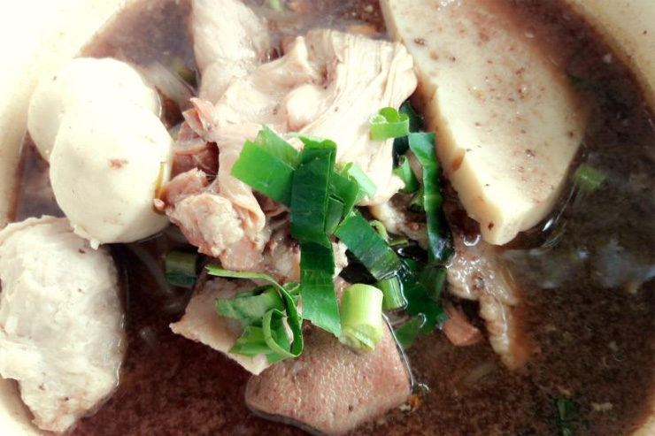 น้ำซุปหอมกรุ่นและออกหวานกลมกลอมรสชาติอร่อยดี ส่วนหมูเด้งเป็นเนื้อล้วนไม่มีแป้งผสมและทำจากเนื้อสะโพกหลังของหมู เวลาเคี้ยวจะสัมผัสได้ถึงความนุ่มและความดึ๋งในตัว ชามหนึ่งธรรมดาจะมีลูกชิ้น 5 ลูก ลูกชิ้นธรรมดา 3 ลูก ลูกชิ้นหมูเด้ง 2 ลูก หมูสด 2-3 ชิ้น หมูตุ๋น 1-2 ชิ้น และหมูยอ 1 ชิ้น ขายในราคา 35 บาท ในปริมาณที่สมราคา กินอิ่มพอดี ถ้าพิเศษ 40 บาท นอกจากก๋วยเตี๋ยวแล้วยังมีหมูตุ๋นหม้อไฟ ข้าวต้มปลาเก๋า กุ้งอบวุ้นเส้น และยำทะเล