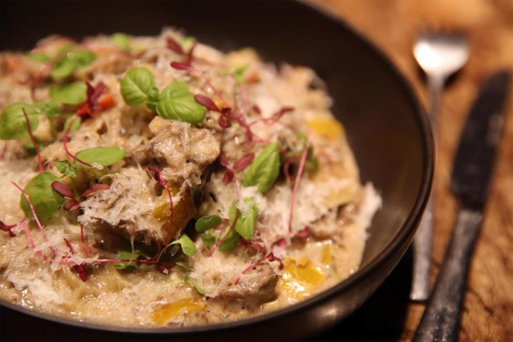 อีกเมนูน่าสน Beef Black Truffle Pasta เนื้อสะโพกวัวนำไปเคี่ยวเป็นเวลากว่า 4 ชั่วโมงจนได้ความนุ่ม จากนั้นราดด้วยครีมทรัฟเฟิล เห็ดแชมปิญอง และโรยหน้าด้วยพาร์เมซานชีส กินคู่กับเส้นเฟตตูชินี