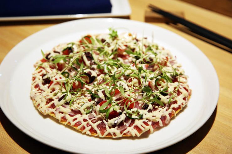 เริ่มต้นด้วยทูน่า พิซซ่า ที่พิซซ่าแป้งบางกรอบ โรยหน้าด้วยเนื้อปลามากุโร่บางๆ และส่วนผสมอื่นๆ รับประทานไปแล้วต่อให้เป็นคนที่ไม่ชอบปลาดิบก็ต้องติดใจ วางุ บีฟ คาร์ปาชิโอ เนื้อวางุ เกรดเอ 5 วางเรียงบนจานอย่างสวยงามราดด้วยน้ำมันงาผสมกับน้ำมันมะกอกร้อนๆ เทลงไปบนเนื้ออย่างรวดเร็ว จนได้เนื้อวางุกึ่งสุกกึ่งดิบ โรยด้วยขิง โชยุ กระเทียม พริก ผักชีญี่ปุ่น รับประทานพร้อมกันจะได้รสชาติเปรี้ยวนำเค็ม เผ็ดตามนิดๆ อร่อยไปอีกแบบ ถ้าให้ดีรับประทานพร้อมๆ กับข้าวญี่ปุ่น ซึ่งทางร้านมีเครื่องสีข้าวเป็นของตัวเอง และตัวข้าวก็ต้องนำจากพื้นที่เพาะปลูกพิเศษที่ให้ข้าวที่มีคุณภาพดีที่สุดส่งให้กับร้านโมริโมโตะโดยเฉพาะเช่นกัน เรียกได้ว่าขนาดข้าวยังคัดสรรกันถึงแหล่งเพาะเมล็ดกันเลยทีเดียว