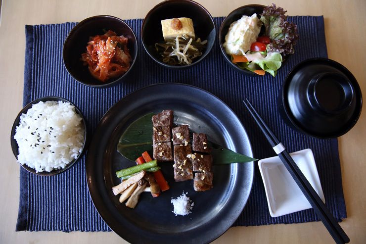 ก่อนไปถึงของหวาน มาลองชุดอาหารกลางวันดูสักหน่อย มีให้เลือกทั้งชุดแซลมอนย่างเตาถ่าน (Grilled Salmon Plate) ที่มีให้เลือกว่าจะย่างเกลือหรือราดซอสเทริยากิ ชุดสเต๊กเนื้อย่างเตาถ่าน (Grilled Beef Rib Eye Plate) ที่ใช้เนื้อริบอายจากออสเตรเลียมาย่างเสิร์ฟ ชุดสเต๊กหมูสันนอกย่างเตาถ่าน (Grilled Pork Loin Plate) และชุดปลาดิบสองชนิดราดซอสทรัฟเฟิล พอนซึ (Salmon and Yellowtail Carpaccio with Truffle Ponzu) แต่ละชุดมาพร้อมข้าวญี่ปุ่น สลัดผัก ซุป ผัดผัก+ไข่หวาน แล้วก็กิมจิ (ไข่หวานกับกิมจิแบบโฮมเมดอร่อยมาก ขอบอก)