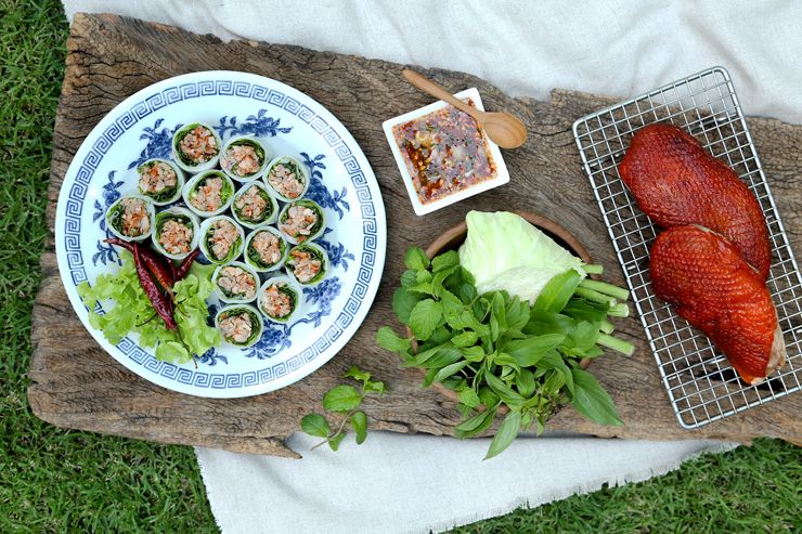ด้วยความที่เป็ดย่างมีไม่มากเพราะเป็นการล้างตู้เย็น อยากกินให้อิ่มและได้เนื้อๆ หนังๆ เลยเอามาห่อกับก๋วยเตี๋ยวแบบก๋วยเตี๋ยวบกหรือก๋วยเตี๋ยวลุยสวน เสริมผักลงในม้วนก๋วยเตี๋ยวที่ม้วนให้เป็นแท่งๆ ทั้งโหระพา ผักกาดหอม ผักสลัดต่างๆ จะเพิ่มผักชีฝรั่งลงไปด้วยก็หอมดี ทำให้ลาบเป็ดย่างของเราดูน่ารับประทานยิ่งขึ้น