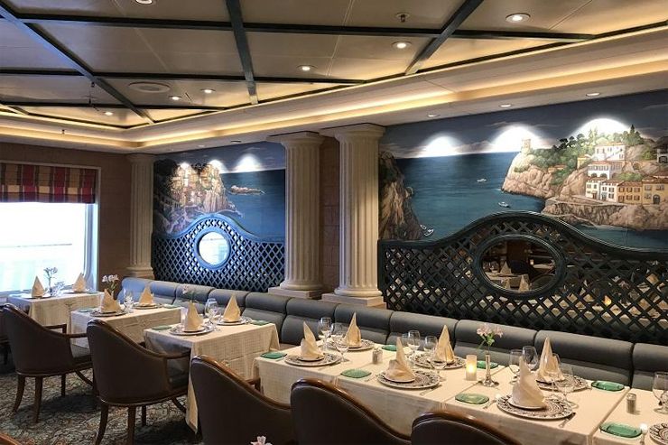 หลังเรือออกจากท่า Kochi ได้ไม่นาน ผมก็ไปเปลี่ยนเสื้อผ้าเป็นชุดใหญ่เพื่อไปกินข้าวมื้อหรูที่ห้อง Sabatini’s  ห้องอาหารระดับซิกเนเจอร์ของเรือ Princess ทุกลำ เรืออเมริกันแต่โดดเด่นด้วยอาหารอิตาเลียน โดยเฉพาะเมนูพาสต้าที่ทำเส้นกันสดๆ บนเรือ รังสรรค์โดยเชฟ Angelo Auriana เชฟอาหารอิตาเลี่ยนแถวหน้าของอเมริกาผู้ร่วมก่อตั้งร้านอาหาร The Factory Kitchen และ Offcine Brera ในเมืองลอสแองเจลิส มีดีกรีระดับนี้การันตีถ้าไม่กินน่าเสียดายแย่ พอถึงเวลานัดหมาย 6 โมงตรง ผมไม่กล้าสายกลัวที่จะหลุดเพราะห้องนี้จุได้ไม่เยอะ กะด้วยสายตาน่าจะมีราวๆ 40 ที่นั่ง ผมเลือกโต๊ะกลมกลางห้องที่ดูหรูหราที่สุดให้สมกับมื้อพิเศษในค่ำคืนนี้ Mr.Sabino ผู้จัดการห้องอาหารมาต้อนรับและพาไปส่งยังที่นั่งด้วยตัวเอง หลังจากทักทายกันประหนึ่งสนิทกันมานานแล้วก็หยิบเมนูมาให้เลือก ดูไปดูมาสุดท้ายเราใช้แนวทางเดิมคือส่งมอบความไว้วางใจให้คุณ Sabino เลือกเมนูที่น่ากินมาให้