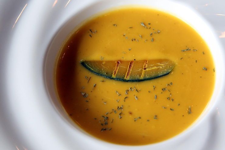 อีกเมนูหนึ่งที่หน้าตาธรรมดาแต่โดดเด่นด้วยสีเหลือง เสิร์ฟมาในชามสีขาวก็คือ ซุปฟักทองญี่ปุ่น กินร้อนๆ แล้วให้ความสดชื่น อยู่ท้อง และให้พลังงานที่ดีในยามอากาศแปรปรวนแบบนี้ และสุดท้ายในเมนูเจก็คือ น้ำแดงผัดโครงการหลวง เลือกใช้ผักจากโครงการหลวงทั้งหมด ปรุงเพียงเล็กน้อย ก็ได้รสชาติกรอบหวานจากผักโดยธรรมชาติ อร่อยยิ่งขึ้นเมื่อกินคู่กับข้าวไรซ์เบอร์รี่จากโครงการหลวงที่เคียงมาในจาน