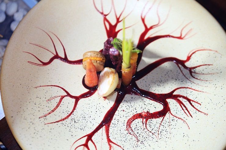 ตามด้วย “Stick to the Roots” เมนูสลัดที่มีรูปลักษณ์แสนจะครีเอท ประกอบด้วยเบบี้แครอต บีตรูทตอบแห้ง มาการงที่ทำจากแครอต และผักต่างๆ ตกแต่งด้วยบีตรูทตเจล รสชาติแปลกใหม่ไม่ซ้ำใคร