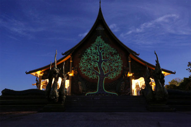 เรื่องของงานศิลปะได้พูดคุยกับ ไกรชนินทร์ จันทรเวโรจน์หรือ ช่างเอ๋ ที่มากำกับดูแลงานที่ยังดำเนินการอยู่ในพระอุโบสถ เขาเล่าถึงต้นกัลปพฤกษ์ด้านหลังว่าเป็นฝีมือการออกแบบของช่างคุณากร ปริญญาปุณโณ ผู้ลงมือติดโมเสกแต่ละชิ้นด้วยตัวเองและเป็นเจ้าของไอเดียใช้สารเรืองแสงรอบต้น โดยมีแรงบันดาลใจมาจากต้นไม้แห่งชีวิตในภาพยนตร์เรื่องอวตาร นอกจากนี้ตัวอุโบสถมีต้นแบบมาจากวัดเชียงทอง ประเทศลาว แต่มีความกว้างมากกว่า 1 เท่า และความยาวมากกว่า 2 เท่า เสาแต่ละต้นลงลวดลายด้วยมือ โดยรอบนอกเป็นลายดอกบัวและสัตว์ทั้งหลายตามคติบัว 4 เหล่า ทางเข้าเป็นต้นสาละ เขยิบเข้ามาเป็นต้นมะขามป้อม ต้นสมอ และด้านในสุดเป็นต้นโพธิ์ ส่วนพระประธานมีผู้นำมาถวายวัด ดั้งเดิมเป็นองค์พระพุทธชินราช แต่ช่างคุณากรได้ออกแบบใหม่โดยถอดรัศมีและพระเกตุมาลาออก แล้วแกะสลักไม้เป็นต้นโพธิ์ไปวางอยู่ด้านหลังพระประธาน