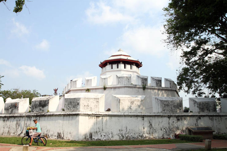 จากพิพิธภัณฑ์เดินข้ามสะพานผ่านฟ้าจะพบกับพระเอกที่คนเมืองกรุงต่างคุ้นตาที่ ป้อมมหากาฬ 1 ใน 2 ป้อมที่ยังหลงเหลือจากการขยายกรุงรัตนโกสินทร์เมื่อครบรอบ 100 ปี เดิมทีป้อมรอบเขตเมืองเก่ามีถึง 14 ป้อม ตั้งอยู่บนแนวกำแพงเมือง แต่ปัจจุบันเหลือเพียงแนวกำแพงป้อมมหากาฬเท่านั้นที่ยังคงสภาพของอิฐเก่าแบบโบราณและเป็นแนวกำแพงเมืองที่ยาวที่สุดที่หลงเหลือให้ลูกหลานได้ชื่นชม
