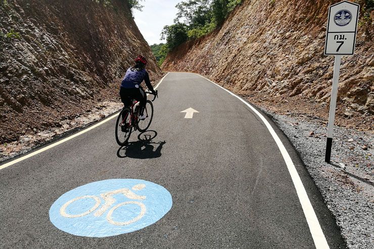 ทางโค้งไหลลงของที่นี่ไม่ใช่เรื่องล้อเล่นที่จะละเลยความสนใจได้เนื่องจากเส้นทางอยู่รอบตีนเขา เรียกง่ายๆ คือด้านซ้ายมือก็คือเหวดีๆ นี่เอง ลงแรงไปแหกโค้งก็มีสิทธิลงเหวได้เลย หลายๆ ช่วงจึงมีการทำรั้วสีขาวกั้นเอาไว้เพื่อความปลอดภัย เราปั่นขึ้นๆ ลงๆ มาตลอดทางจนจำไม่ได้ว่ามีกี่เนิน แต่การมองป้ายบอกหลักกิโลเมตรที่เพิ่มขึ้นเรื่อยๆ ก็ช่วงสร้างกำลังใจได้เป็นอย่างดี