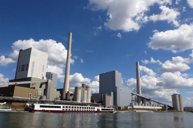 ถนนที่ตัดผ่านโรงไฟฟ้า GKM นั้น พาพวกเราไปจนถึงแม่น้ำไรน์ อย่างที่ได้ข้อมูลมาจริงๆ และยังมีบริการเรือข้ามฟากไปยังอีกฝั่งหนึ่งด้วย ยิ่งไปกว่านั้นตั๋วรถรางแบบเหมาวันที่พวกเราซื้อไว้นั้นก็สามารถใช้เป็นตั๋วเรือข้ามฟากได้ด้วยเช่นกัน พวกเราจึงชวนกันลงเรือข้ามฟากไปยังอีกฝั่งของแม่น้ำไรน์ซึ่งอยู่ตรงข้ามกับโรงไฟฟ้า จึงได้เห็นภาพชัดๆ ว่า โรงไฟฟ้า GKM นั้นมีขนาดใหญ่มาก และทอดขนานไปกับฝั่งแม่น้ำไรน์