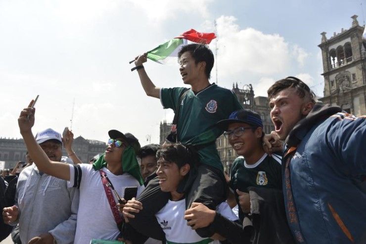 แฟนลูกหนักทีมชาติเม็กซิโก ต่างออกมาโห่ร้องเฉลิมฉลองด้วยความยินดี ด้านนอกสถานทูตเกาหลีใต้ ในกรุงเม็กซิโกซิตี้ เมืองหลวง เพื่อแสดงความยินดีร่วมกับเจ้าหน้าที่ทูตของเกาหลีใต้ หลังจากที่ฟุตบอลทีมชาติเกาหลีใต้ สามารถเอาชนะทีมสายแข็งอย่างทีมชาติเยอรมนีไปได้ 2 ประตูต่อ 0 ในรอบแบ่งกลุ่มนัดสุดท้าย
