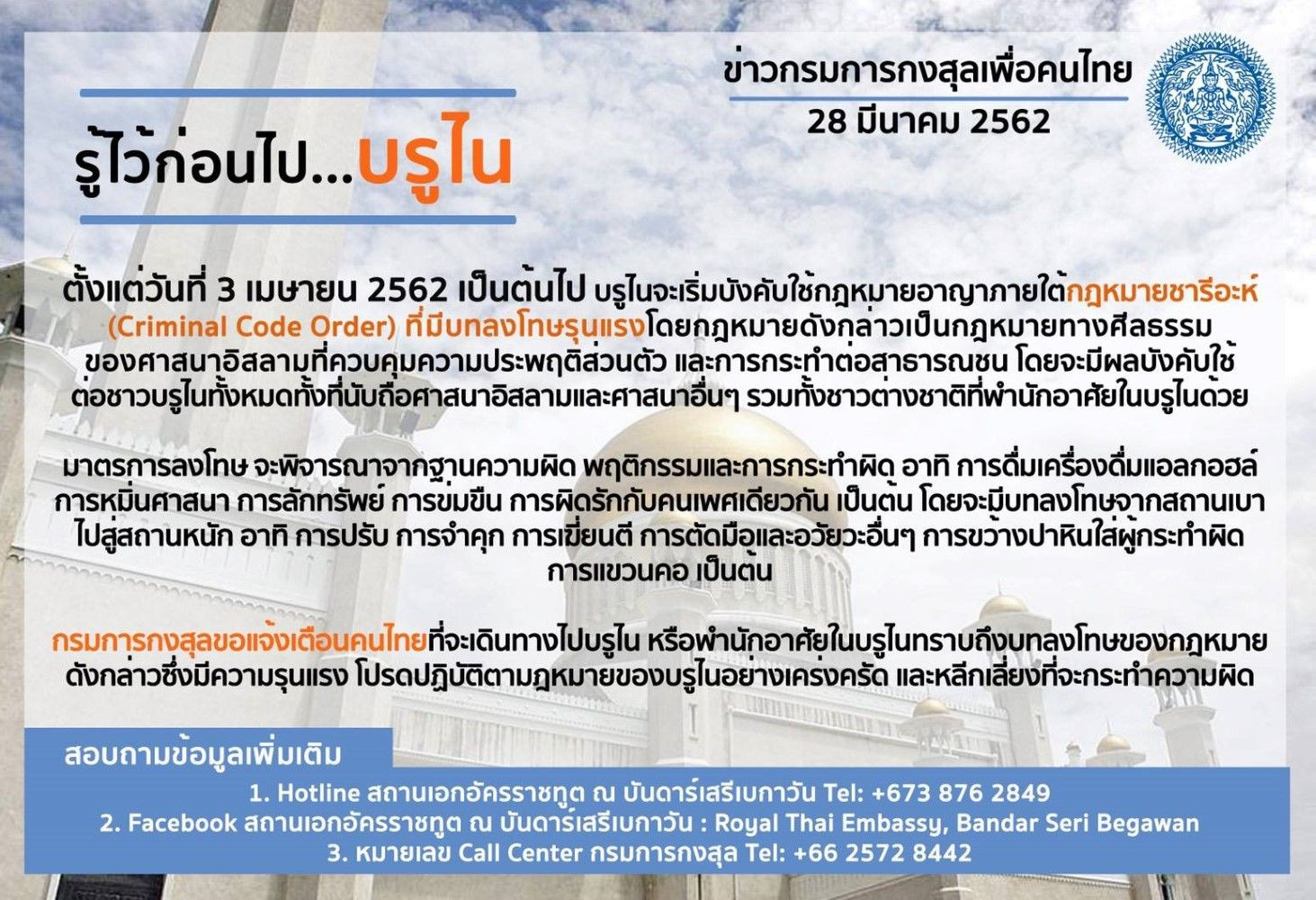 เมื่อวันที่ 28 มี.ค.62 กรมการกงสุล กระทรวงการต่างประเทศได้เผยแพร่เอกสารข่าวแจ้งว่า ตั้งแต่วันที่ 3 เม.ย.62 เป็นต้นไป ประเทศบรูไนจะเริ่มบังคับใช้กฎหมายอาญาภายใต้ กฎหมายซารีอะห์ (Criminal Code Order) ที่มีบทลงโทษรุนแรง โดยกฎหมายดังกล่าวเป็นกฎหมายทางศีลธรรมของศาสนาอิสลามที่ควบคุมความประพฤติส่วนตัว และการกระทำต่อสาธารณชน โดยจะมีผลบังคับใช้ต่อชาวบรูไนทั้งหมด ทั้งที่นับถือศาสนาอิสลามและศาสนาอื่นๆ รวมทั้งชาวต่างชาติที่พำนักอาศัยในบรูไนด้วย