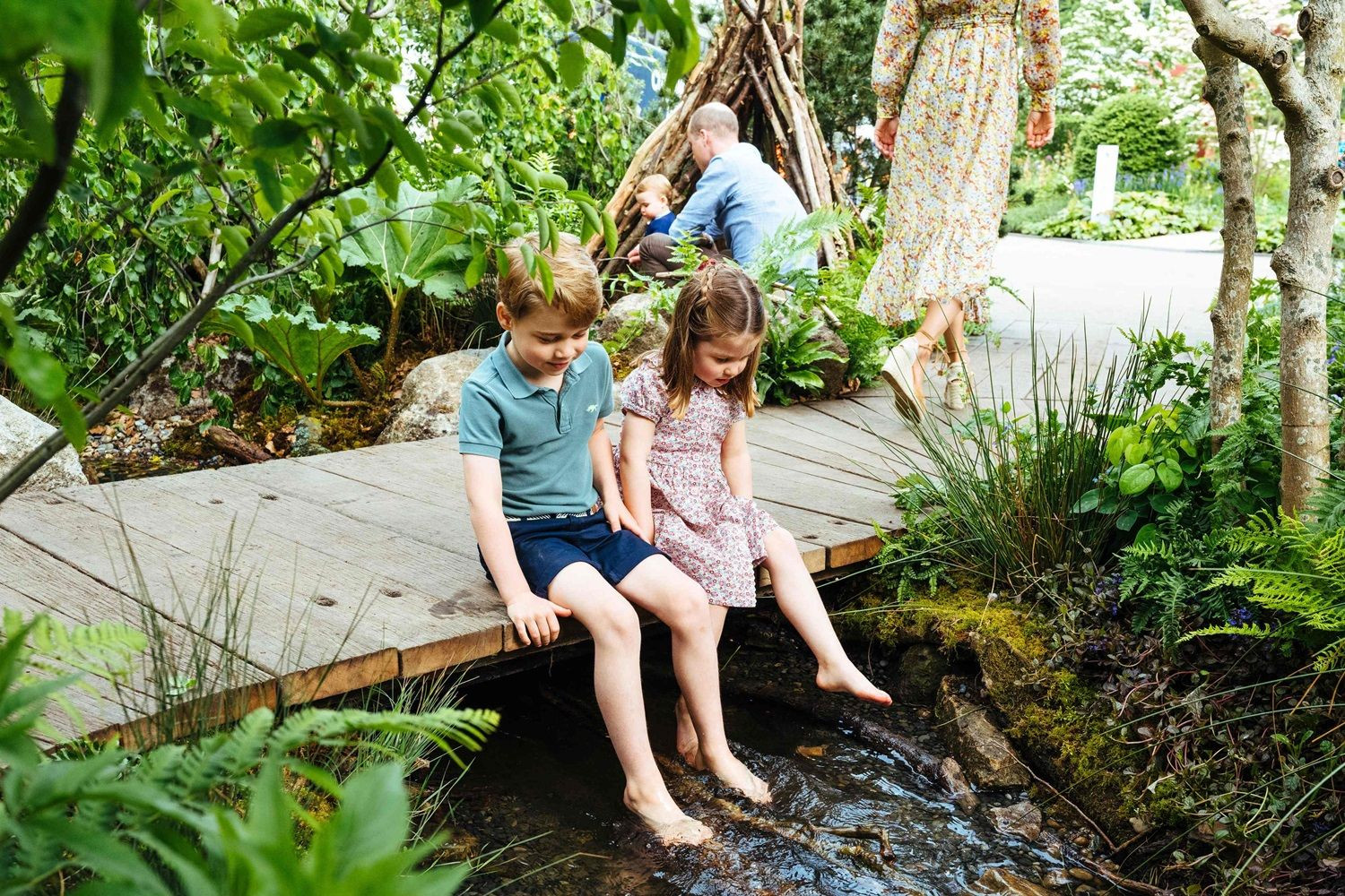 ภาพจากพระราชวังเคนซิงตัน เผยแพร่เมื่อวันที่ 19 พฤษภาคม 2019 แสดงให้เห็นเจ้าชายจอร์จแห่งเคมบริดจ์ กับเจ้าหญิงชาร์ลอตต์แห่งเคมบริดจ์ทรงประทับนั่งดูลำธารในสวน นอกจากนี้ยังจะเห็นเจ้าชายวิลเลียมดยุคแห่งเคมบริดจ์แห่งอังกฤษพร้อมด้วยพระโอรสองค์สุดท้อง และแคทเธอรีนดัชเชสแห่งเคมบริดจ์ที่กำลังเดินข้ามสะพาน