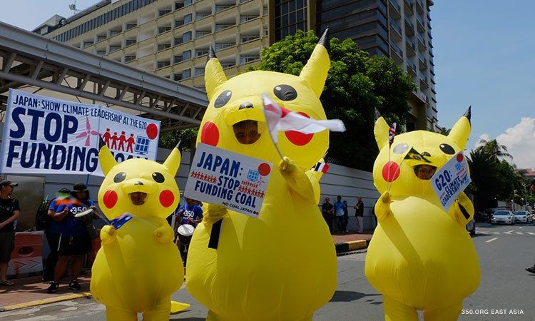 ซีเอ็นเอ็นฟิลิปปินส์รายงานว่า กลุ่ม350.org ซึ่งเป็นกลุ่มเคลื่อนไหวด้านการเปลี่ยนแปลงสภาพอากาศ ได้รวมตัวกันที่ด้านนอกสถานทูตญี่ปุ่นในกรุงมะนิลาของฟิลิปปินส์ในวันนี้ (25 มิ.ย.) โดยการแต่งชุดมาสคอตปิกาจู เพื่อเรียกร้องให้รัฐบาลญี่ปุ่นยุติโครงการลงทุนในพลังงานถ่านหิน ในช่วงที่ญี่ปุ่นเตรียมเป็นเจ้าภาพในการประชุมสุดยอดกลุ่มประเทศอุตสาหกรรมจี20ช่วงปลายเดือนนี้
