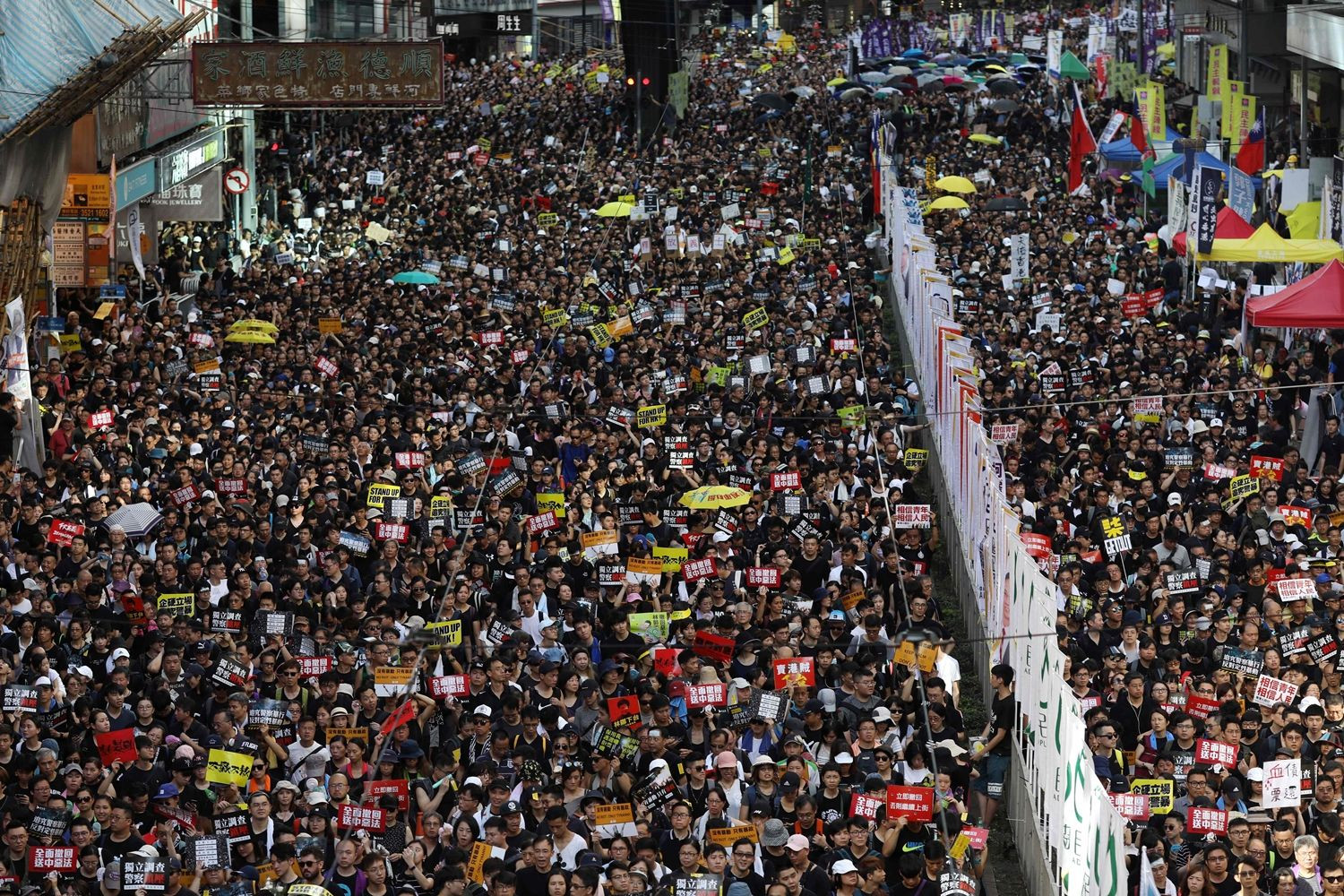 ต่อมาเมื่อมีผู้มาชุมนุมที่ด้านนอกรัฐสภามากขึ้น ประชาชนหลายหมื่นที่พากันสวมเสื้อดำ จึงรวมตัวกันเดินขบวนไปตามท้องถนนมุ่งหน้าไปยังสวนสาธารณวิกทอเรีย พาร์ก และบางส่วนแยกตัวไปชุมนุมในพื้นที่อื่นๆ กลายเป็นอีกหนึ่งการชุมนุมใหญ่ที่ยืดเยื้อมาเกือบเดือน โดยครั้งนี้ผู้ชุมนุมเรียกร้องให้แคร์รี่ หลั่ม ผู้บริหารสูงสุดของฮ่องกงลงออกจากตำแหน่ง และต่อต้านกฎหมายส่งผู้ร้ายข้ามแดนให้กับจีน