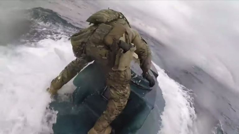 คลิปดังกล่าวแสดงระหว่างที่เจ้าหน้าที่ยามฝั่งได้ใช้เรือเร็วพยายามไล่ล่าเรือดำน้ำลำดังกล่าว พร้อมกับตะโกนเป็นภาษาสเปน สั่งให้ผู้ต้องสงสัยมอบตัว จนสามารถนำเรือเข้าเทียบเรือดำน้ำของแก๊งค้ายาได้ ในระหว่างนั้นเรือดำน้ำลำดังกล่าวก็พยายามหนี เจ้าหน้าที่ได้ทุบฝาเรือให้ผู้ต้องสงสัยหยุดเรือ ก่อนที่เจ้าหน้าที่จะสามารถบังคับให้คนในเรือเปิดฝาครอบออก จนสามารถจับกุมได้ในที่สุด