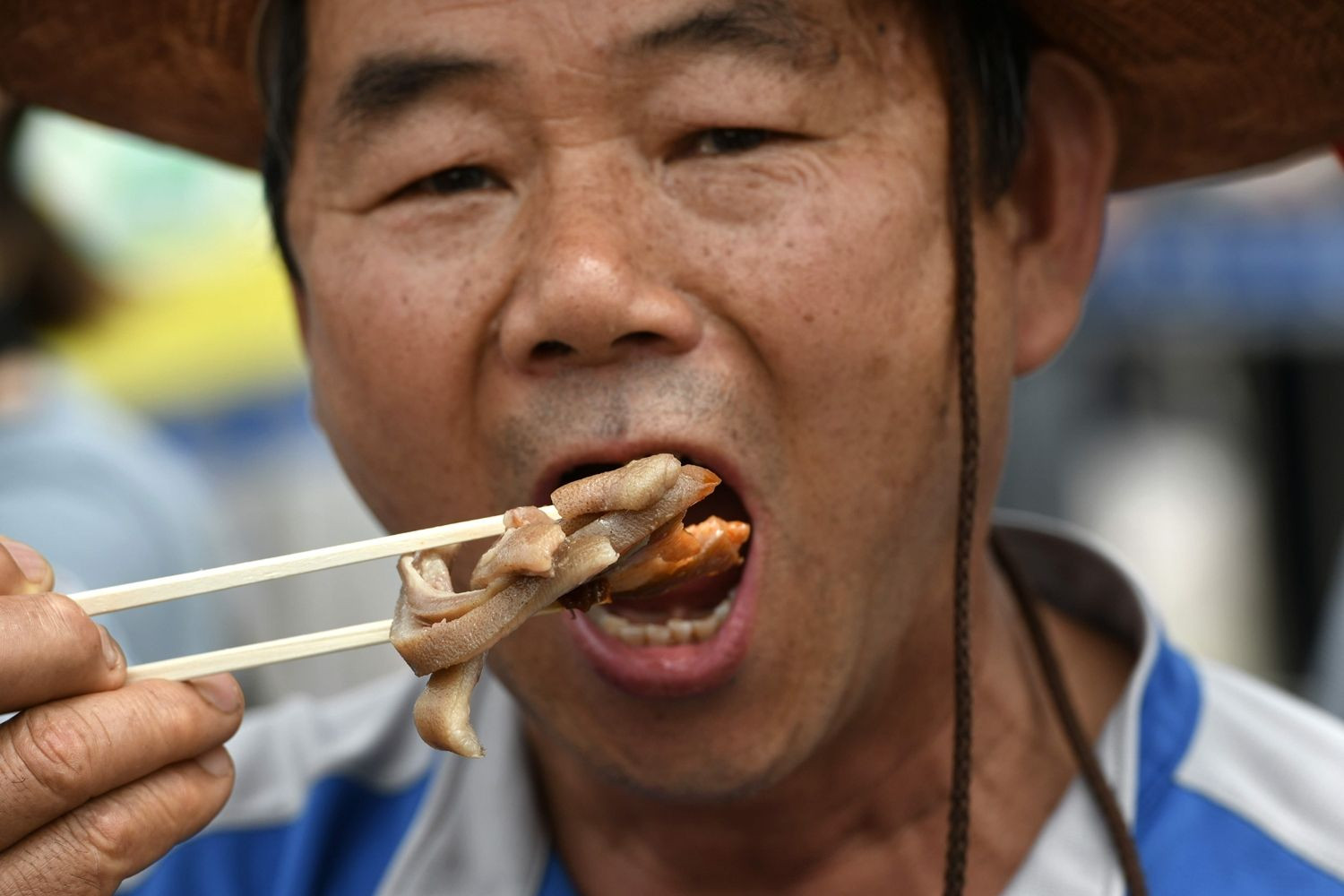 เกษตรกรผู้เลี้ยงสุนัขเพื่อกำนเนื้อชาวเกาหลีใต้รวมตัวกันกินเนื้อสุนัขประจันหน้ากับกลุ่มนักสิทธิสัตว์ที่ประท้วงต่อต้านการกินเนื้อสุนัขที่ด้านหน้าของรัฐสภาของเกาหลีใต้ในกรุงโซล พร้อมกับโดยแจกใบปลิวอ้างคุณประโยชน์ด้านสุขภาพของการกินเนื้อสัตว์แสนรักของมนุษย์