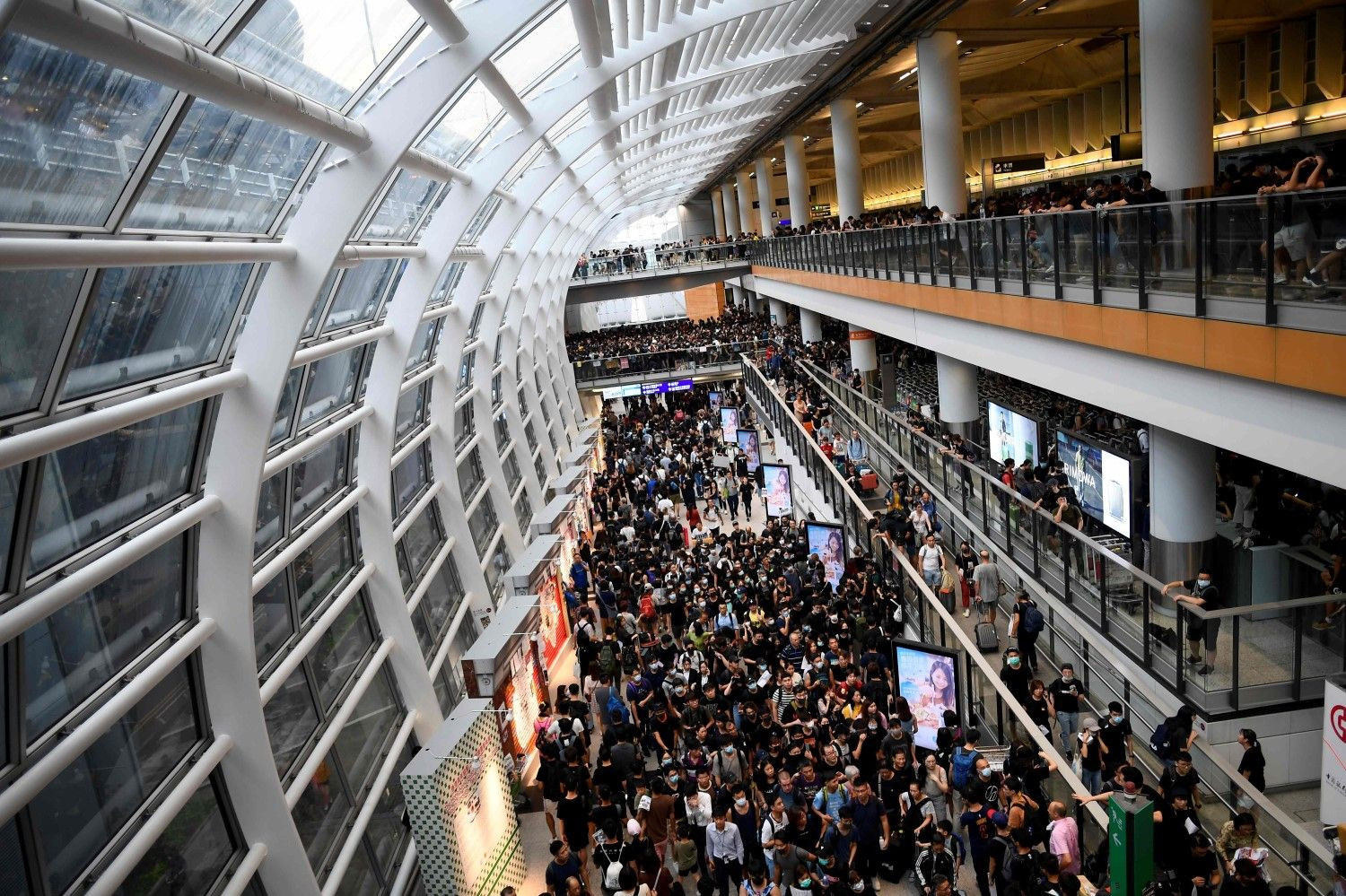 ก่อนหน้านี้เมื่อเวลาประมาณ 15.30 น. ตามเวลาท้องถิ่น ท่าอากาศยานฮ่องกงได้แถลงว่า เที่ยวบินที่เหลือในวันนี้ได้ถูกยกเลิกทั้งหมด ยกเว้นเที่ยวบินขาออกที่มีการเช็คอินผู้โดยสารเรียบร้อยแล้ว รวมทั้งเที่ยวบินขาเข้าที่ได้ลงจอดในฮ่องกงแล้ว