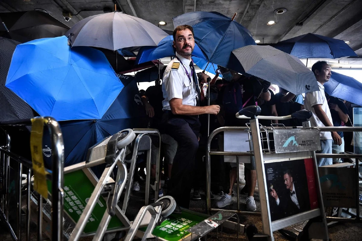 เมื่อเดือนที่แล้วผู้ประท้วงปักหลักที่ล็อบบี้ขาออกของสนามบิน ทำให้มีการยกเลิกเที่ยวบินเกือบ 1,000 เที่ยวในช่วงเวลา 2 วันของเหตุวุ่นวาย และต่อมาศาลได้ออกคำสั่งห้ามการชุมนุมในพื้นที่ของสนามบินที่มิได้รับอนุญาตให้ทำการประท้วง