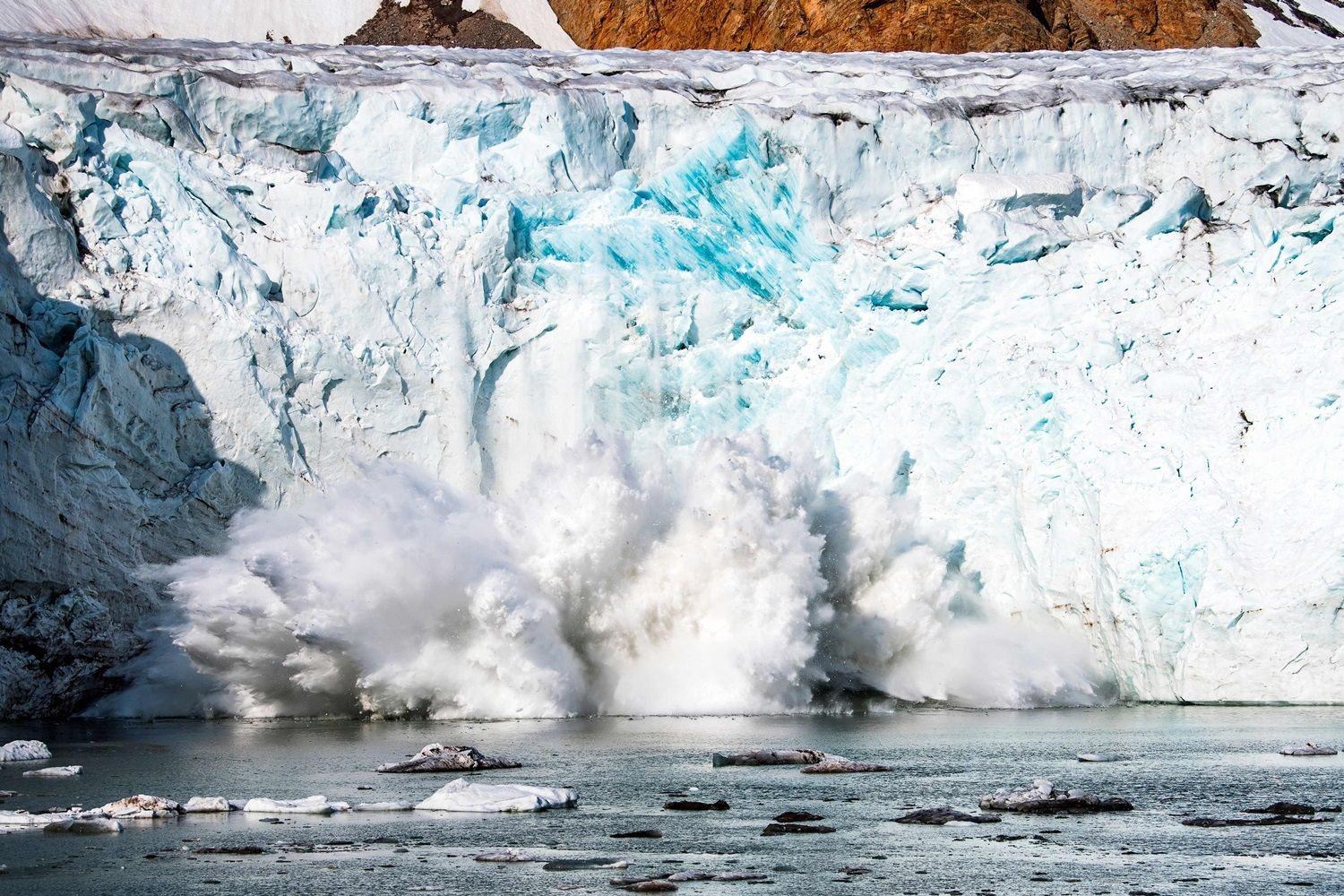 ก้อนน้ำแข็งขนาดใหญ่แตกตัวออกจากธารน้ำแข็ง Apusiajik ทางชายฝั่งตะวันออกเฉียงใต้ของกรีนแลนด์ โดยปกติแล้วการแตกตัวของก้อนน้ำแข็งจะเกิดขึ้นเมื่อธารน้ำแข็งขยายตัว และมักจะเกิดเสียงดังตามมา นอกจากจะเป็นความสวยงามจากธรรมชาติแล้ว การตกกระทบน้ำของก้อนน้ำแข็งอาจก่อให้เกิดแรงกระเพื่อมรุนแรงในรัศมีหลายกิโลเมตร จนอาจทำให้เรือขนาดเล็กคว่ำได้