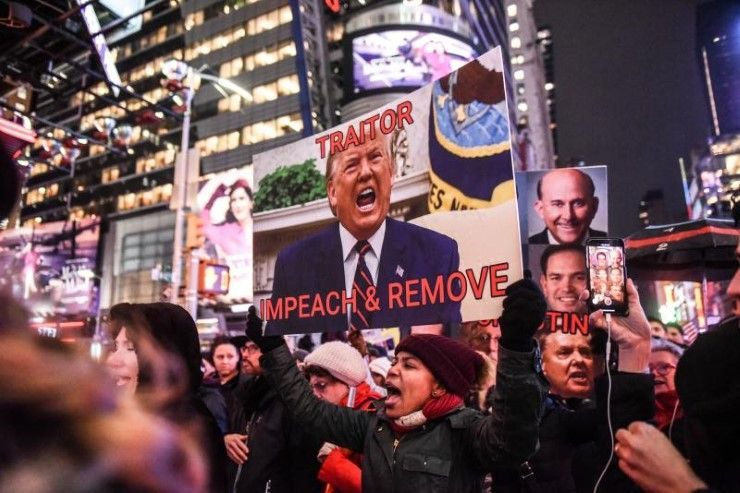 สื่อสหรัฐรายงานว่า ในย่านไทม์สแควร์ใจกลางมหานครนิวยอร์ก กลุ่มผู้ชุมนุมได้รวมตัวกันราวร้อยคน เพื่อแสดงจุดยืนสนับสนุนกระบวนการถอดถอนประธานาธิบดีโดนัลด์ ทรัมป์ ซึ่งสภาผู้แทนราษฏรสหรัฐที่มีพรรคเดโมแครตครองเสียงข้างมากอยู่ เตรียมลงมติโหวตถอดถอนทรัมป์อย่างเป็นทางการในคืนวันพุธนี้ตามเวลาท้องถิ่นกรุงวอชิงตัน