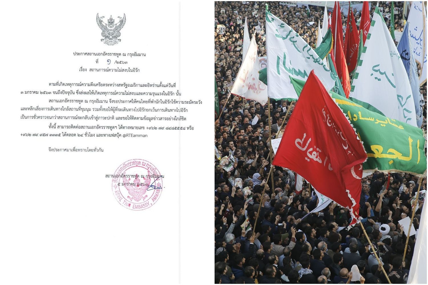 เมื่อวันที่ 5 ม.ค.63 สถานเอกอัครราชทูต ณ กรุงอัมมาน ได้ออกประกาศฉบับที่ 1/2563 เรื่อง "สถานการณ์ความไม่สงบในอิรัก" ระบุว่า ตามที่เกิดเหตุการณ์ความตึงเครียดระหว่างสหรัฐอเมริกาและอิหร่านตั้งแต่วันที่ 3 ม.ค.2563 จนถึงปัจจุบัน ซึ่งส่งผลให้เกิดเหตุการณ์ความไม่สงบและความรุนแรงในอิรักนั้น