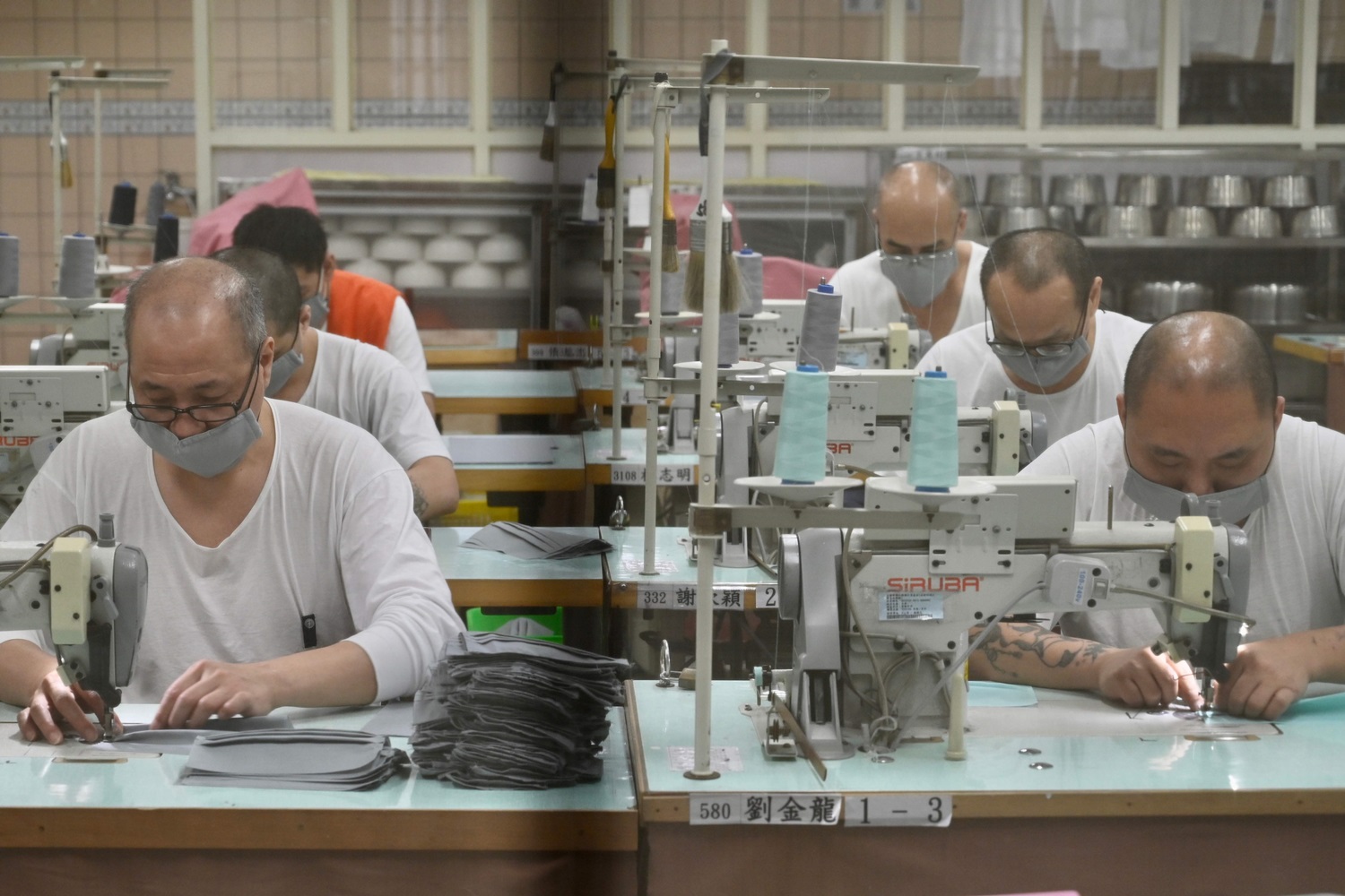 ผู้ต้องขังชายกลุ่มหนึ่งในเรือนจำไทเปของไต้หวันเร่งผลิตหน้ากากอนามัยแข่งกับเวลา บางครั้งต้องทำงานล่วงเวลาเพื่อผลิตสินค้าให้ทันตามความต้องการท่ามกลางภาวะขาดแคลน