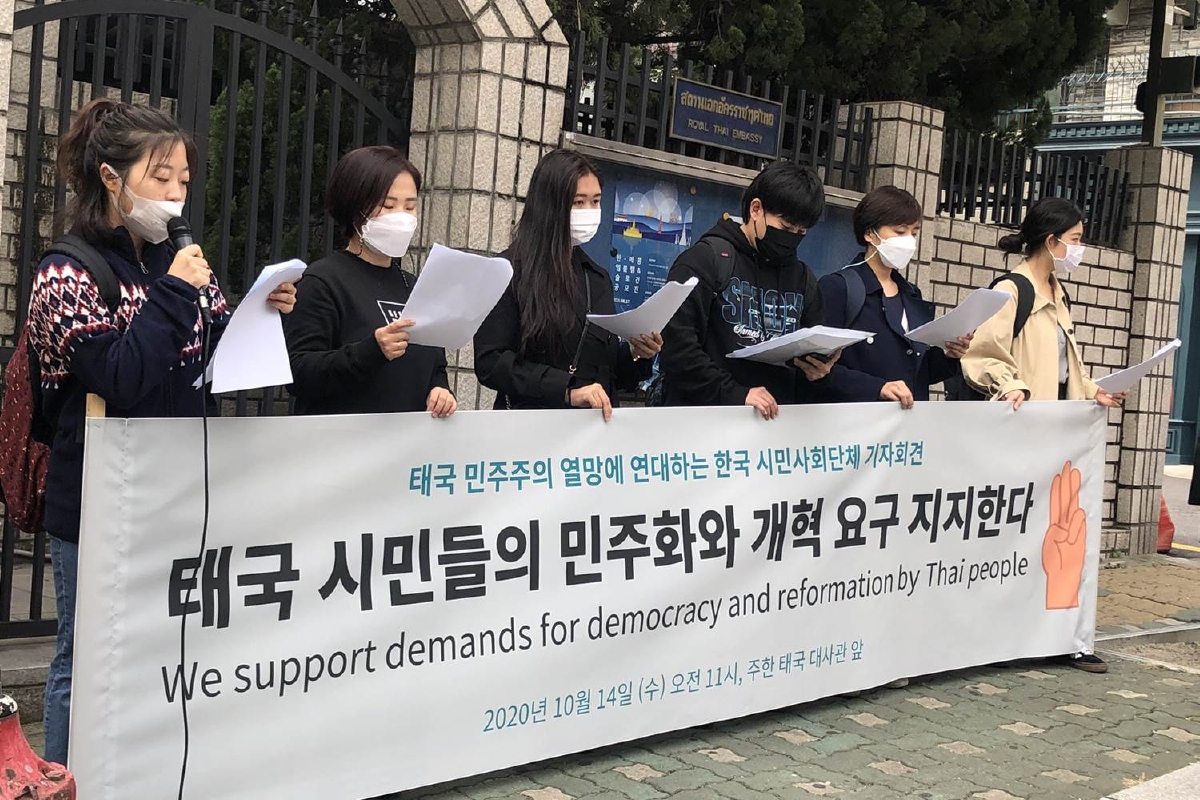 กลุ่มคนไทยในเกาหลีใต้รวมตัวกันบริเวณด้านนอกสถานเอกอัครราชทูตไทยในกรุงโซลเพื่ออ่านข้อเรียกร้อง รวมทั้งถือป้ายข้อความสนับสนุนการเรียกร้องประชาธิปไตยและการเปลี่ยนแปลงของคนไทย โดยการรวมตัวกันเป็นไปด้วยความสงบ และมีการสวมหน้ากากอนามัยเพื่อป้องกันการแพร่ระบาดของเชื้อโคโรนาไวรัส