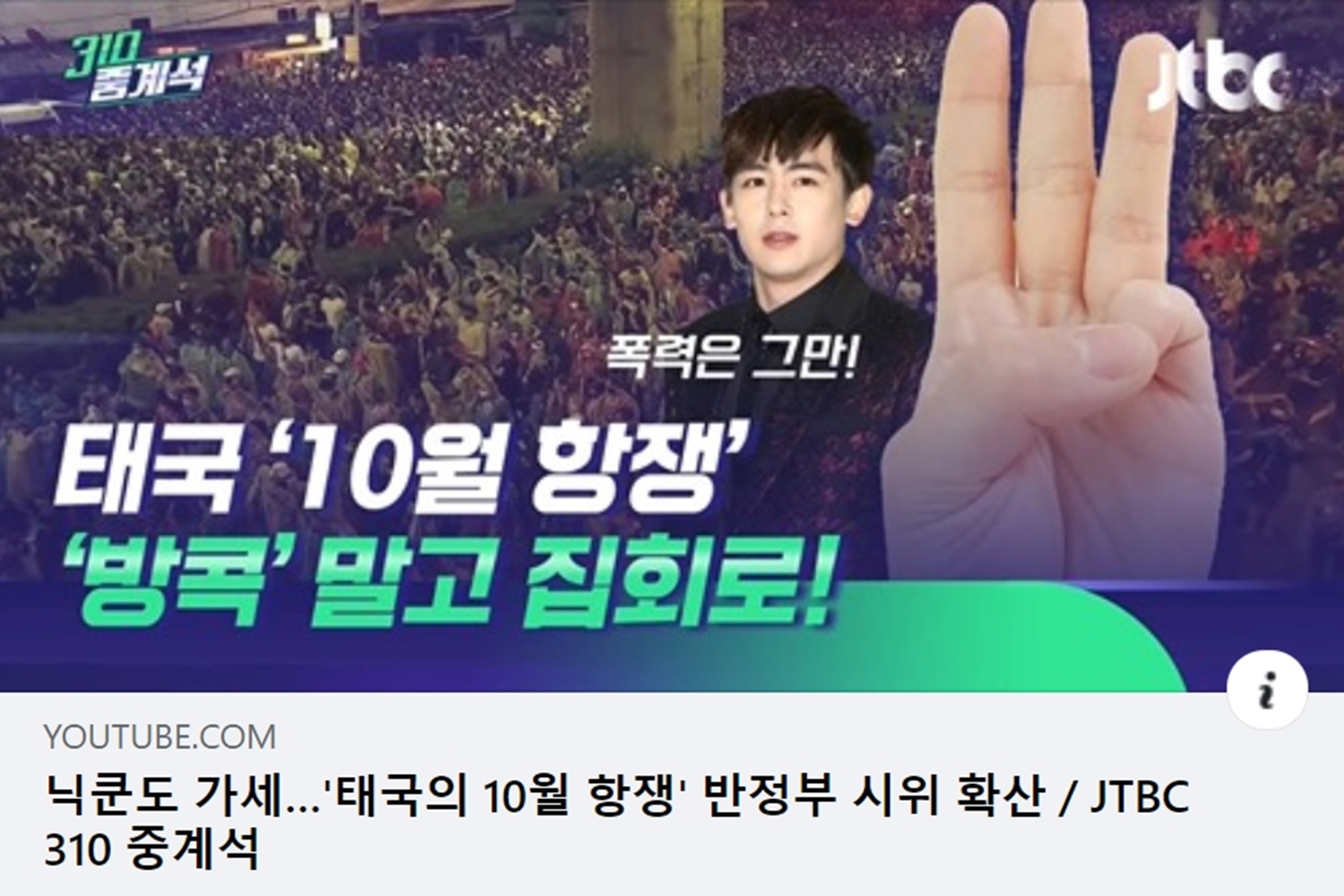 เมื่อวันที่ 19 ตุลาคม JTBC News ช่องเคเบิลจากเกาหลีใต้รายงานสถานการณ์ชุมนุมในประเทศไทยหลัง นิชคุณ หรเวชกุล นักร้องชาวไทยที่โด่งดังในเกาหลีออกมาทวีตลงบนทวิตเตอร์ส่วนตัว (@Khunnie0624) ว่าไม่สนับสนุนการใช้ความรุนแรงที่เกิดขึ้นในเหตุการณ์ประท้วง