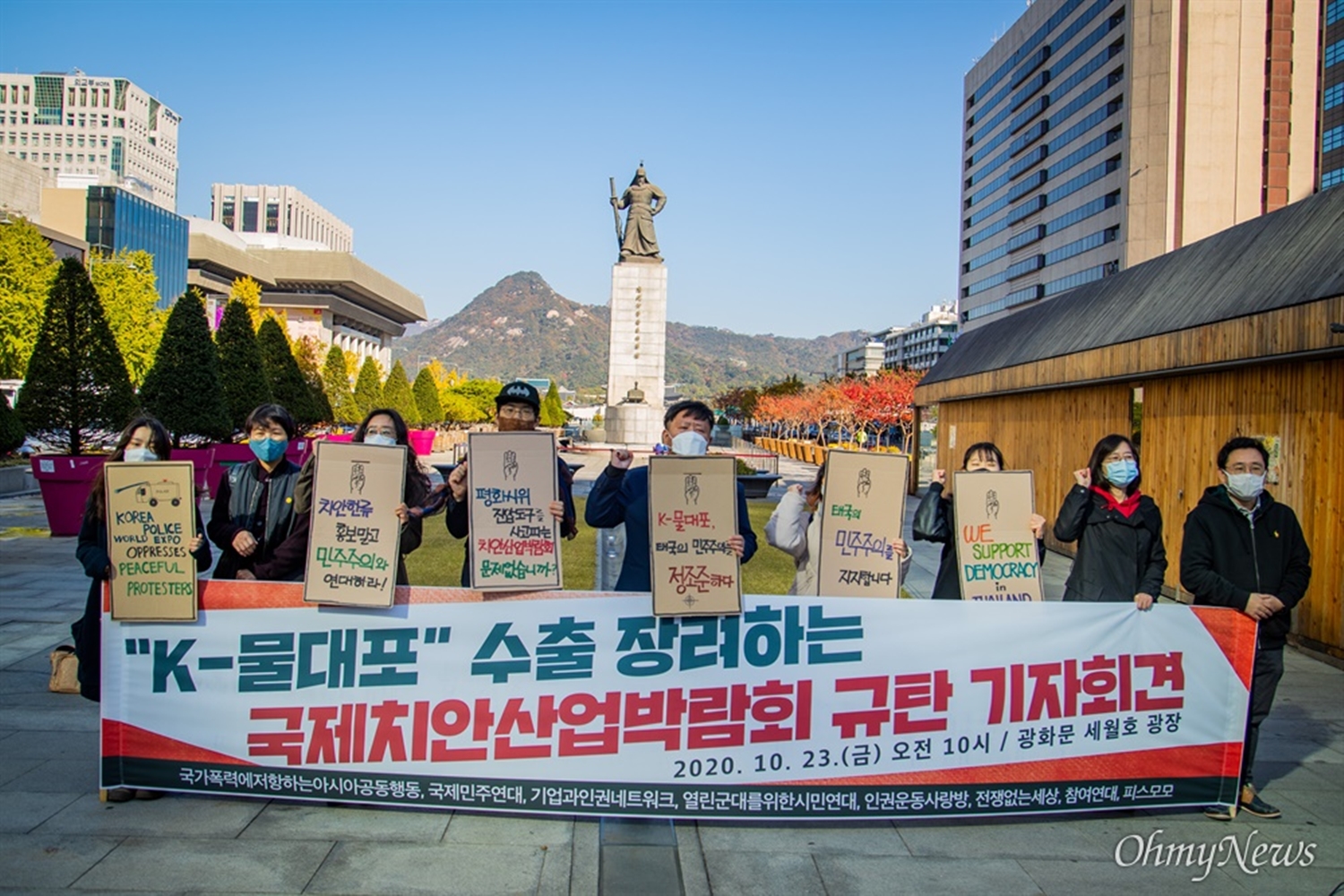 สำนักข่าวท้องถิ่นเกาหลีรายงาน เช้าวันที่ 23 ตุลาคม สมาชิกองค์กรภาคประชาสังคมเกาหลีใต้ออกมาชุมนุมเรียกร้องที่จัตุรัสควังฮวามุน กรุงโซล เพื่อเรียกร้องให้รัฐบาลเกาหลีใต้ยุติการส่งออกรถฉีดน้ำแรงดันสูงให้กับรัฐบาลไทยและประเทศอื่นๆ