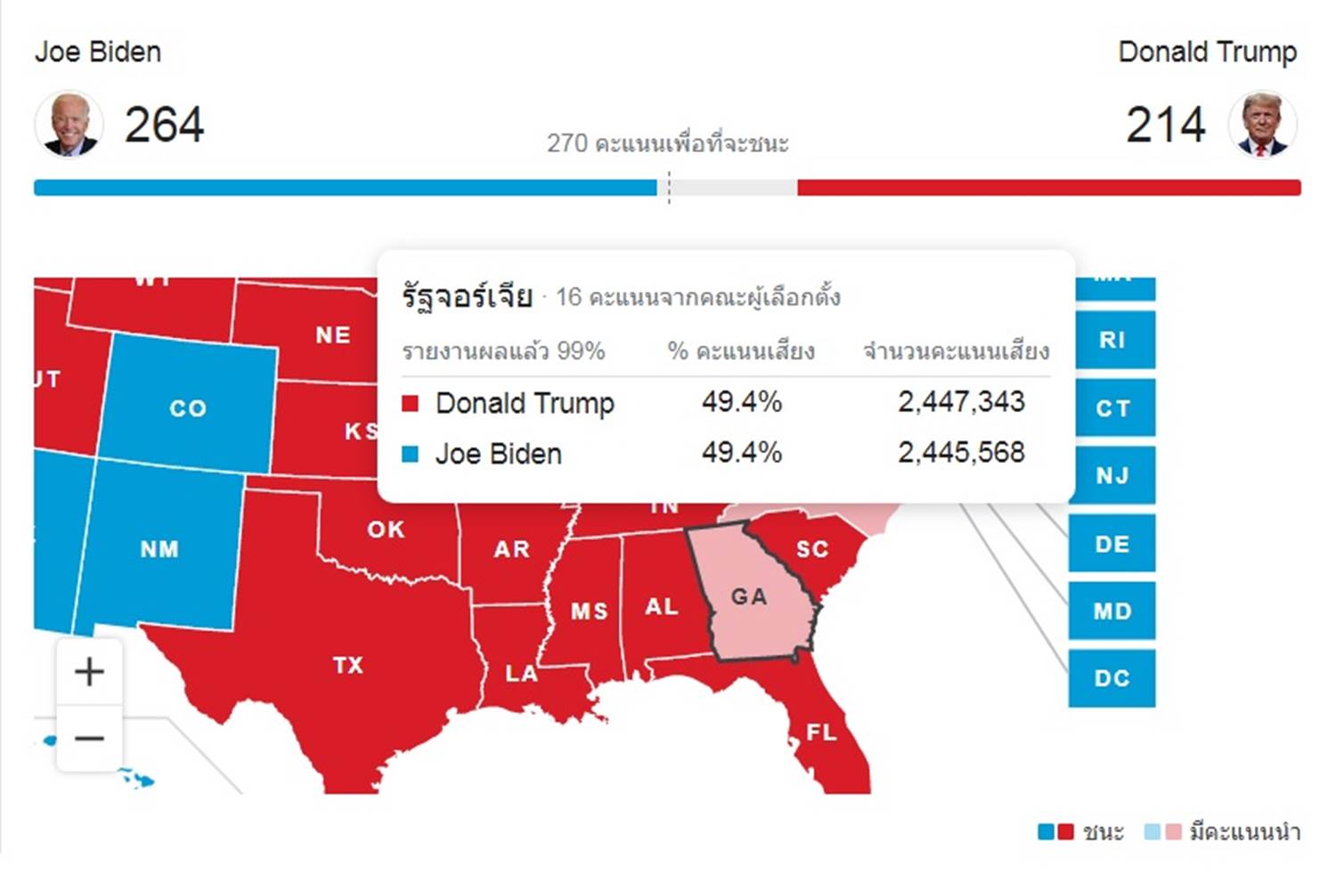 การนับคะแนนในอีก 5 รัฐที่เหลือตอนนี้ รัฐจอร์เจียน่าจับตามากที่สุด เนื่องจากคะแนนของทรัมป์ทิ้งห่างไบเดนไม่มากแล้ว และเหลือที่ยังไม่นับอีกเพียง 1% เท่านั้น