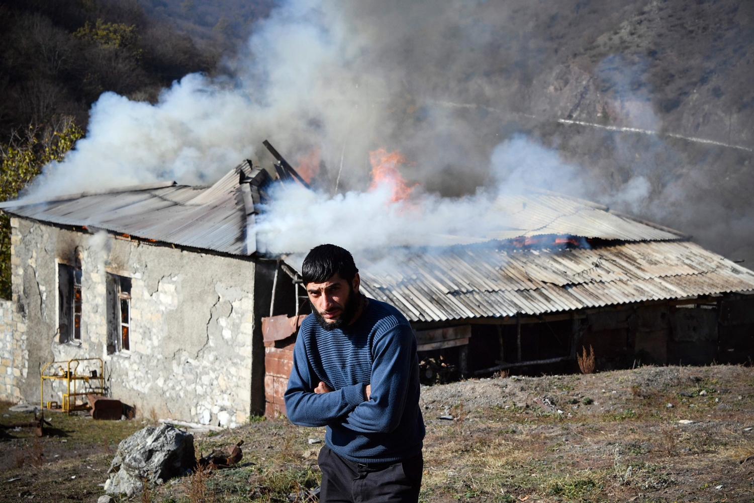 ผู้สื่อข่าวของสำนักข่าว AFP เก็บภาพสะเทือนใจระหว่างที่ผู้อยู่อาศัยชาวอาร์เมเนียคนหนึ่งจุดไฟเผาบ้านของเขาในหมู่บ้านชาเรกตาร์ นอกเมืองคัลบาจาร์ เมื่อวันที่ 14 พฤศจิกายน 2020 ซึ่งเป็นพื้นที่ความขัดแย้งทางทหารระหว่างอาร์เมเนียและอาเซอร์ไบจานในพื้นที่ที่เป็นกรณีพิพาทของทั้งสองฝ่ายคือ แคว้นนากอร์โน-คาราบัค