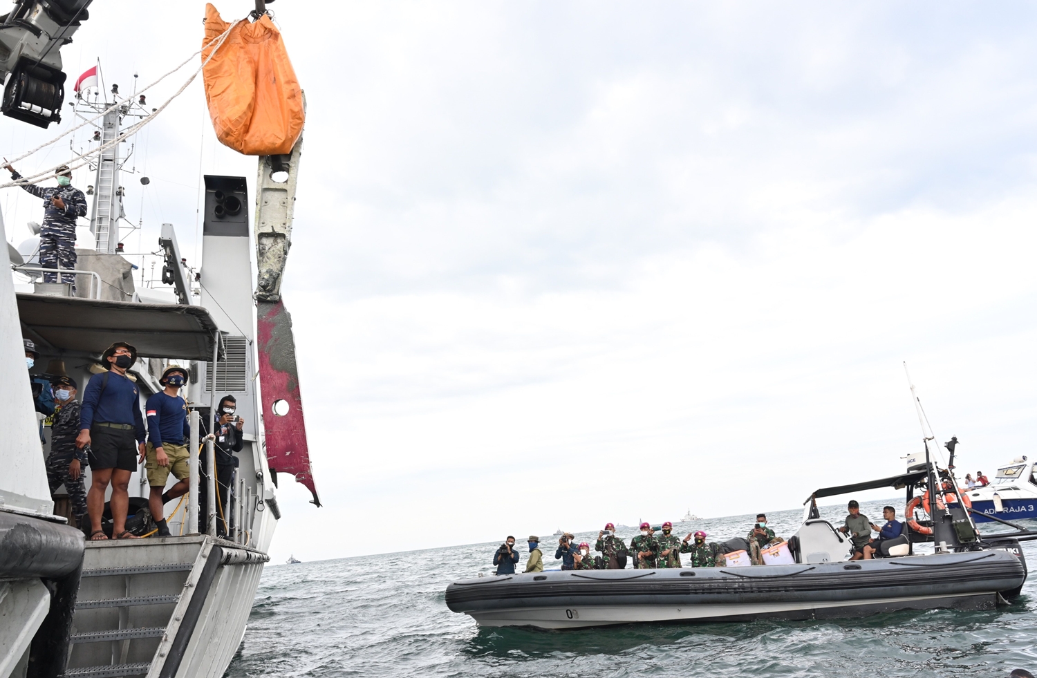 ในภาพ ลูกเรือของกองทัพเรือกู้ซากปรักหักพัง ระหว่างปฏิบัติการกู้คืนใกล้เกาะลันจัง หลังจากเกิดเหตุเครื่องบินของ Sriwijaya Air เที่ยวบิน SJ182 ตกลงในทะเลชวาเมื่อวันที่ 9 มกราคม