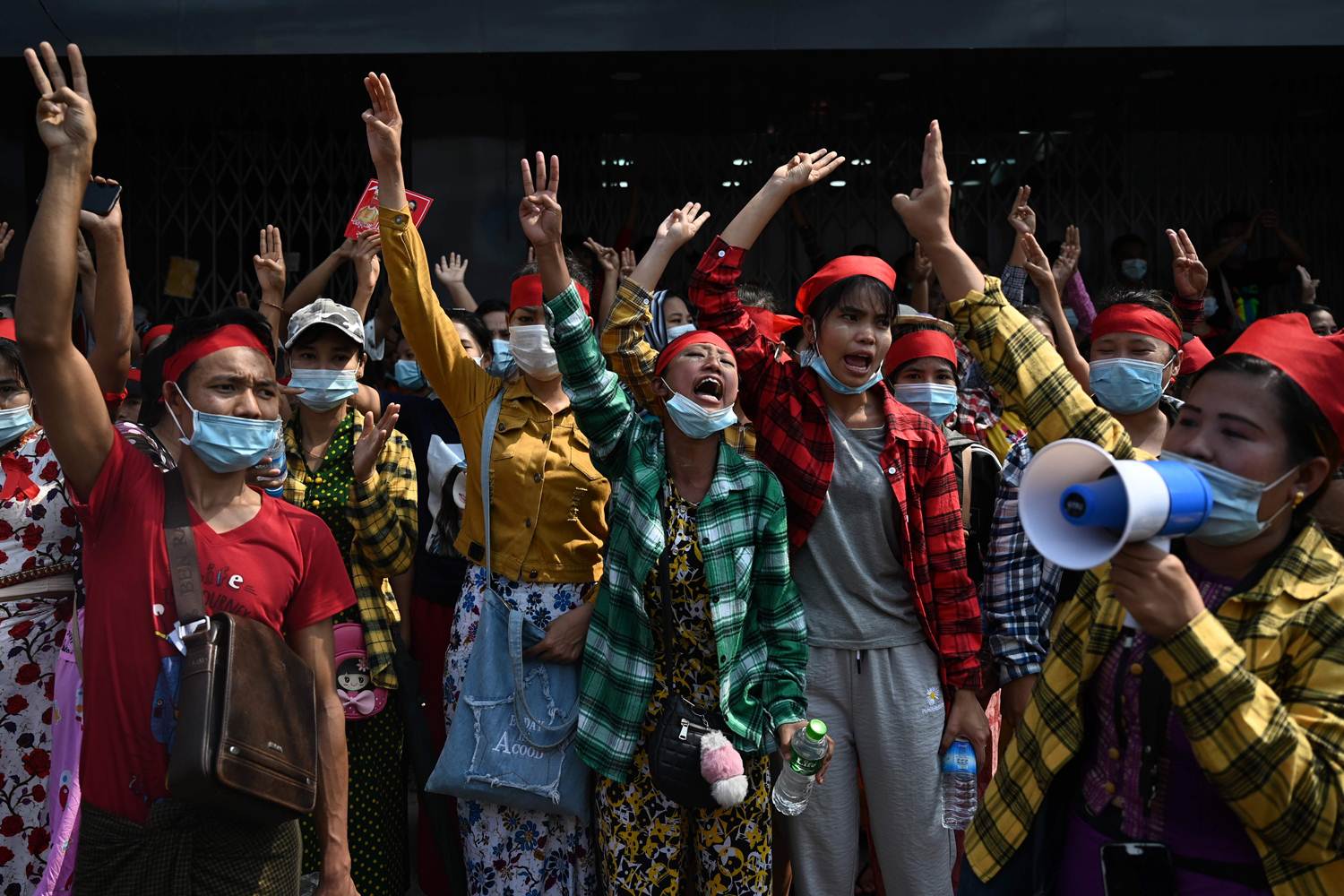 บรรดานักเรียนนักศึกษาและประชาชนชาวเมียนมาหลายพันคนพร้อมใจกันเดินขบวนต่อต้านการทำรัฐประหารบนถนนในย่านธุรกิจการค้าของเมืองย่างกุ้ง พร้อมทั้งชูสามนิ้ว โบกธงแดงซึ่งเป็นสัญลักษณ์ของพรรคสันนิบาตแห่งชาติเพื่อประชาธิปไตย หรือเอ็นแอลดีของอองซานซูจี และตะโกนว่า “ไม่เอาเผด็จการทหาร!” “สู้เพื่อประชาธิปไตย” นับเป็นการประท้วงครั้งใหญ่ที่สุดนับตั้งแต่กองทัพยึดอำนาจเมื่อวันที่ 1 ก.พ.ที่ผ่านมา